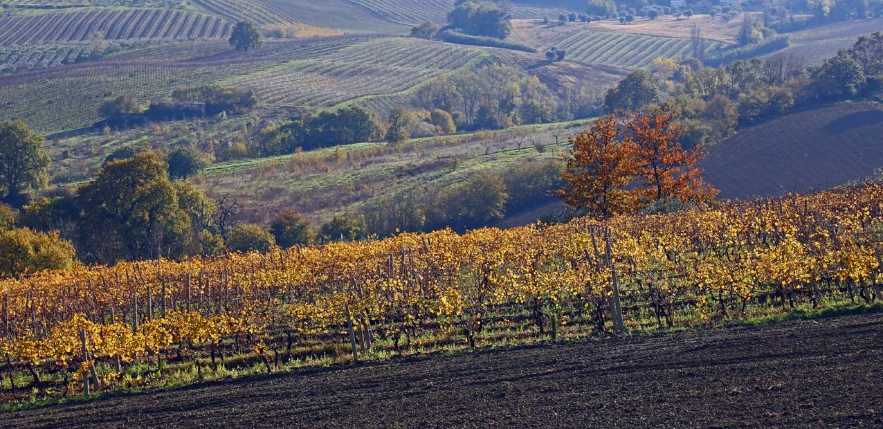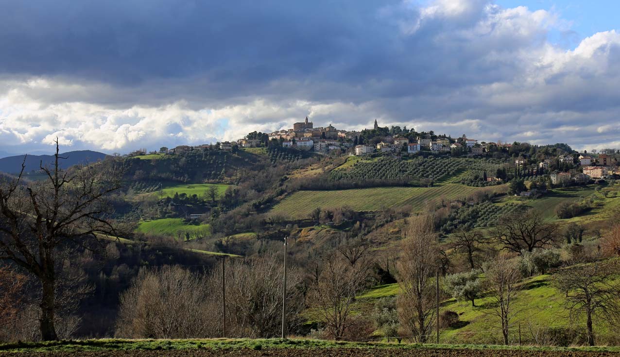 Sanfte Hügel, vielseitige Landwirtschaft, typische Siedlungen (alt: oben auf dem Hügel; neu: unten entlang der Verkehrswege). Zur Adria 25 Kilometer, zu den Bergen des Apennin 25 Kilometer.